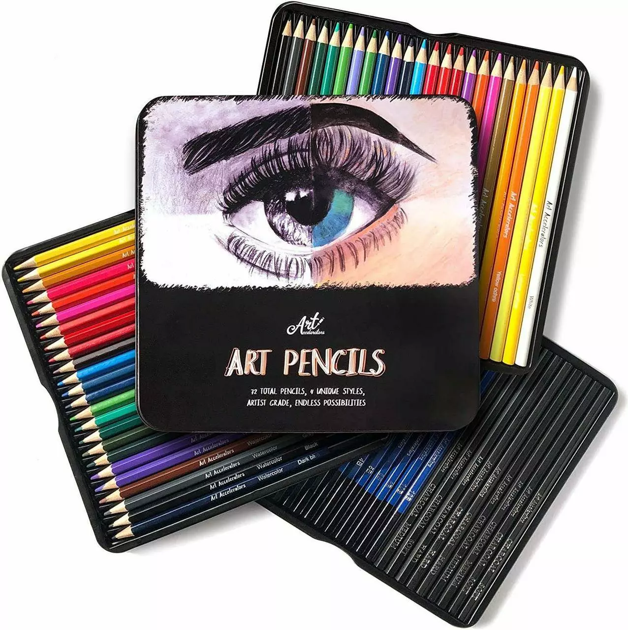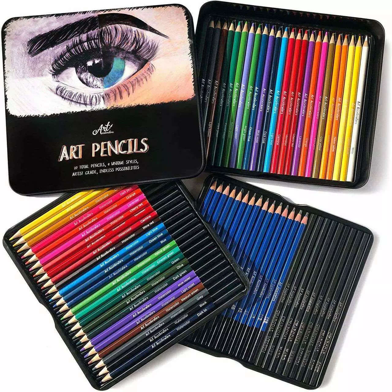 Карандаши в металлическом пенале 72 предмета графитные, акварельные, цветные и угольные