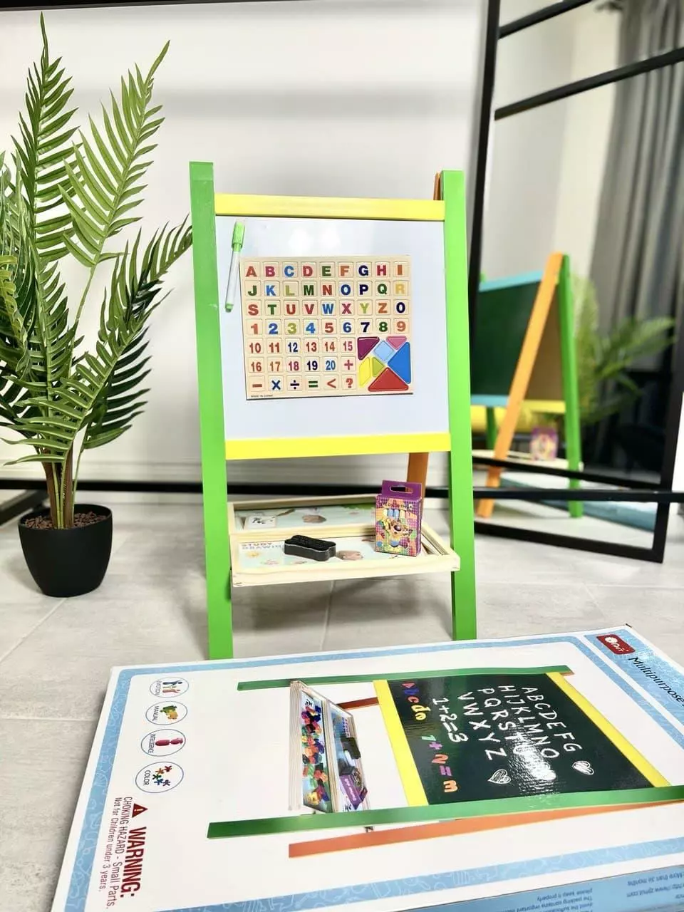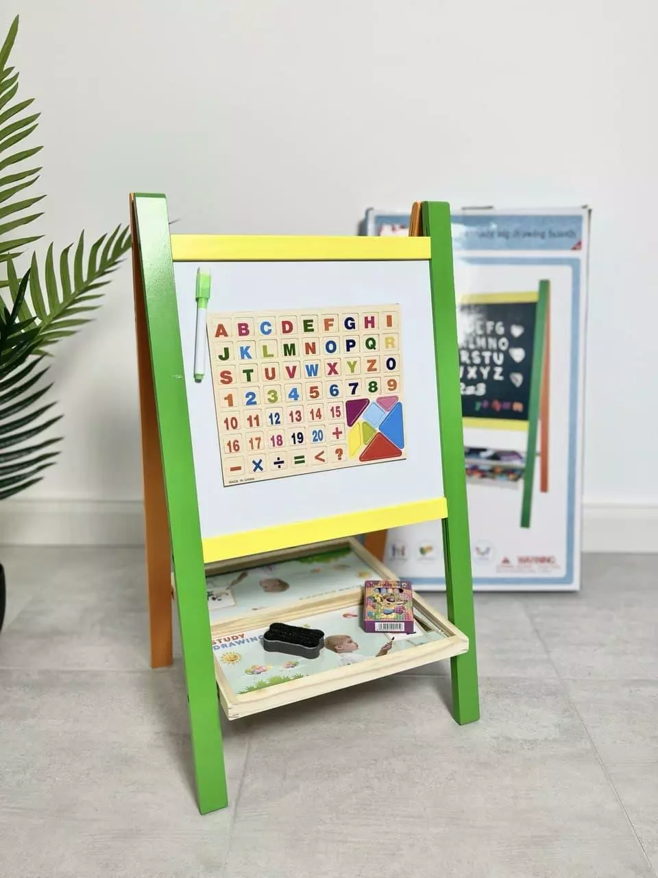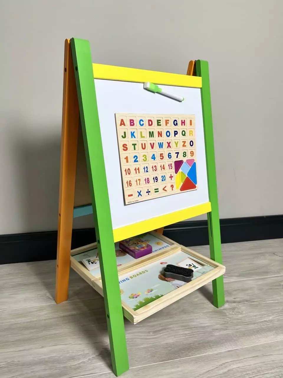 В набор кроме мольберта входят буквы и цифры, маркер для рисования