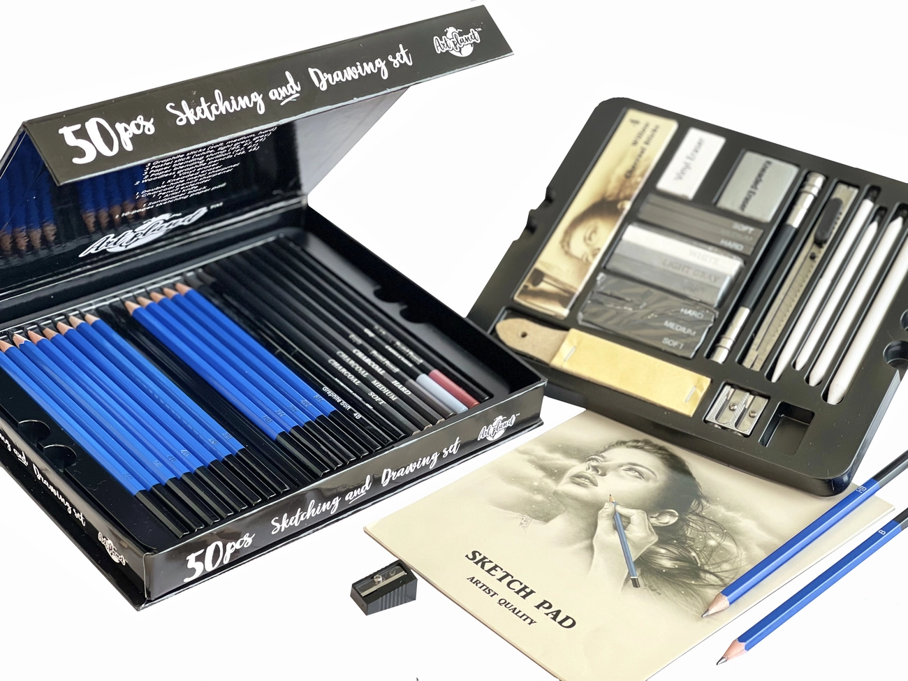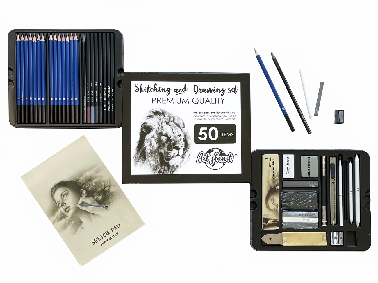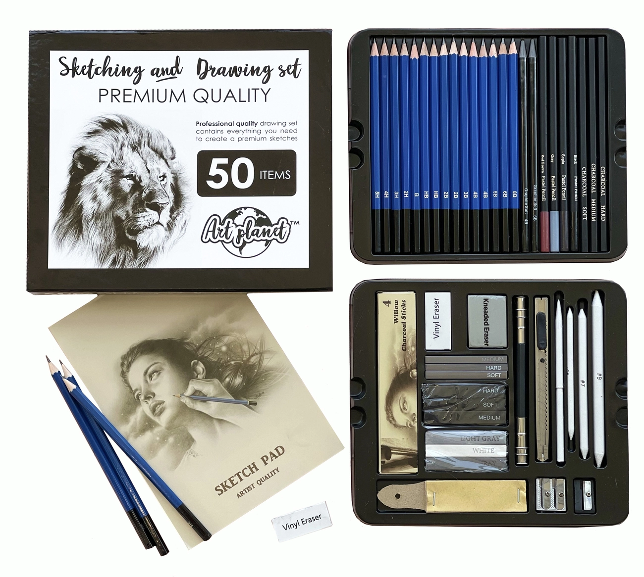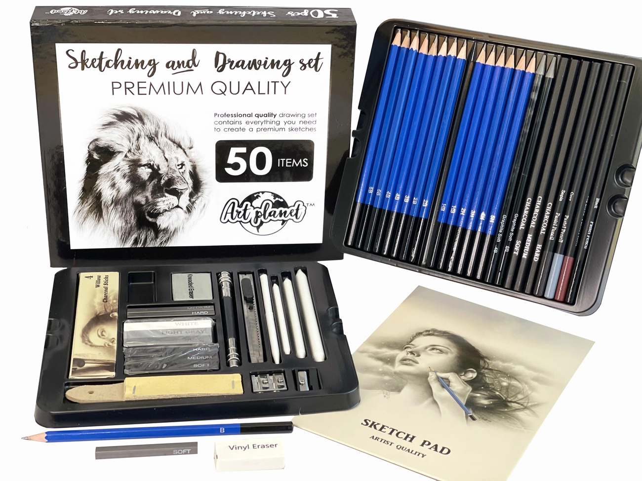 У професійному наборі для художника містить 50 предметів, включаючи паперову краї, пастельні, вугільні і графітові олівці, ластики, скріпки та інші предмети.